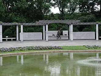 The circular hedges and pool are supported by a 9 ft × 72 ft (2.7 m × 21.9 m) trellis that curves around the back of the memorial.[11] Underneath the trellis are three walls with inscriptions that are 4 feet (1.2 m) high,[11] which include the following quotes: