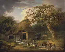 George Morland (26 June 1763 – 29 October 1804) was an English painter. His early work was influenced by Francis Wheatley, but after the 1790s he came into his own style. His best compositions focus on rustic scenes: farms and hunting; smugglers and gypsies; and rich, textured landscapes informed by Dutch Golden Age painting.[1]