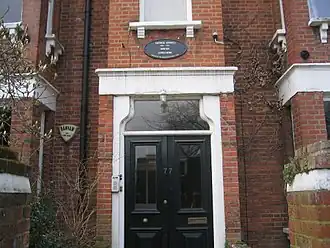 In England, he settled back in the family home at Southwold, renewing acquaintance with local friends and attending an Old Etonian dinner. He visited his old tutor Gow at Cambridge for advice on becoming a writer.[40] In 1927 he moved to London.[41] Ruth Pitter, a family acquaintance, helped him find lodgings, and by the end of 1927 he had moved into rooms in Portobello Road;[42] a blue plaque commemorates his residence there.[43] Pitter's involvement in the move "would have lent it a reassuring respectability in Mrs. Blair's eyes". Pitter had a sympathetic interest in Blair's writing, pointed out weaknesses in his poetry, and advised him to write about what he knew. In fact he decided to write of "certain aspects of the present that he set out to know" and ventured into the East End of London—the first of the occasional sorties he would make intermittently over a period of five years to discover the world of poverty and the down-and-outers who inhabit it.[44]