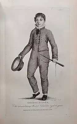 Born in the town of Moretonhampstead, Devon, England, he displayed a natural skill at calculation from an early age. In childhood, his father, William Bidder, a stonemason, exhibited him as a "calculating boy", first in local fairs up to the age of six, and later around the country.[4] In this way his talent was turned to profitable account, but his general education was in danger of being completely neglected.[5]