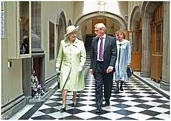 As the Presiding Officer has a role in advising the monarch, Reid was appointed a member of the Privy Council of the United Kingdom in 2004.[26] He oversaw the completion of the new Scottish Parliament building at Holyrood and the move from its temporary site on The Mound to Holyrood in 2004.[27] At the official opening of the new building that year, he made a keynote speech in which he paid tribute to the construction as an architectural achievement, and urged parliamentarians to "listen to the building" to inspire them in their future endeavours.[28]