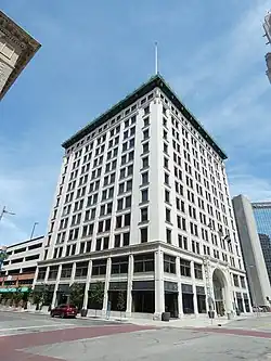 In 1912 Mills formed a partnership with three of his employees, George V. Rhines, Lawrence S. Bellman and Charles M. Nordhoff, in the new firm of Mills, Rhines, Bellman & Nordhoff. The firm was incorporated in 1929.[3] From their base in Toledo this firm was responsible for buildings as far east as Boston and as far west as San Francisco.[4] In 1944, following the deaths of his partners, Bellman assumed control of the firm, renaming it Bellman, Gillett & Richards. The firm was later known as Richards, Bauer & Moorhead under John N. Richards and as Bauer, Stark & Lashbrook under Orville H. Bauer before closing in 1999.[5] Works of these successor firms, in association with others, include the Front Street office buildings in Columbus and the former Fiberglas Tower, once the tallest building in Toledo.