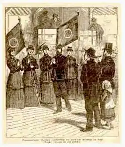 By 1880, Booth's son Bramwell Booth had matured and became his father's secretary. Railton, who since his youth had had a wish to be a missionary, persuaded Booth to send him to New York to begin the Army's work there. He was well suited to such work, being a skilled linguist, dedicated, and hard-working, and both he and his superiors felt more comfortable with him on the frontier than at headquarters. For example, at the celebration to mark the launch of the Salvation Army Assurance Society he sat on the platform barefoot and in sackcloth to register his disapproval of this worldly turn.[3] With male officers being few in number, Railton took Captain Emma Westbrook and six other young women with the intention of training them for the work on the voyage to the United States.[6]