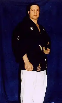 At the Great Falls Bukokan, Thanos started his studies in Kenjusu, the art of wielding the Japanese sword in 1991. Master Ki Whang Kim awarded Thanos a 7th degree Black Belt in Tae Kwon Do in 1992. In the course of his pursuit of Kenjusu studies, Thanos received a Kyosei (Black Belt) from Sensei Fredirick Lovert. In 1998, Thanos opened a dojo (training studio) in Rockville, MD which specialized in Tae Kwon Do, Kenjusu and Aikido. At the Living Legends Award Ceremony in Washington, D.C., in 1999, Thanos received a special award and the recognition from Robert E. Everhart.[13] Thanos and Mitchell Bobrow, both of whom started their martial arts careers at the studio of legendary trainer Master Ki Whang Kim, are the only two students of Kim to be awarded the highest ranked of 7th degree Black Belt by the Grand Master Kim. In 2009, Thanos was inducted into the Tae Kwan Do Hall of Fame and celebrated for his "reliance on not any one style of attack in his arsenal but an array of sweeps, punches, round and back kicks while integrating them into a continuous fury."[14]