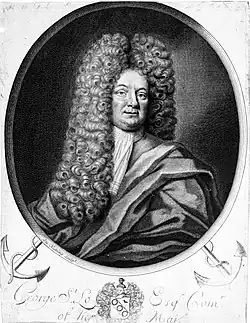 St Lo was born on 19 April 1655, the fourth son of John St Lo of Little Fontmel, Dorset. His mother was Margaret, née Fawconer, the daughter of William Fawconer of Salisbury.[1] George's grandfather was Edward St Lo, of Knighton, Wiltshire. George's family gave him important political connections, as he descended on his father's side from the Hyde family. His great-grandmother Elizabeth was the granddaughter of Laurence Hyde, of Hatch, Wiltshire, who was the grandfather of Edward Hyde, 1st Earl of Clarendon. St Lo's parentage brought him the important patronage of Laurence Hyde, 1st Earl of Rochester, which aided his rise through the navy.[2] He was a third cousin of Queen Mary II and Queen Anne, which also was a factor in his later actions in support of the Orangist cause.