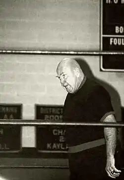 Looking to supplement his income, he got into the world of Detroit-area professional wrestling, but in order to protect his privacy, he wrestled using a mask and the name "the Student".[4] Gary Hart served as the Student's manager and had to explain to the announcers why his client could not apply any legitimate holds or maneuvers instead relying on only his undisciplined brute strength.[10] Myers was soon scouted by World Wide Wrestling Federation (WWWF) champion Bruno Sammartino and began working in Pittsburgh in 1967 on the popular Studio Wrestling TV show broadcast on WIIC-TV (later WPXI-TV) Channel 11. Sammartino had liked the character Myers developed of a wild man with incredible strength. However, he had him drop the mask, as well as the title of the Student. Looking to hide his real name, Myers opted for the alias "George Steele". According to Michigan High School Hall of Fame coach George Steele of Warren, he and Myers were coaching against each other in a high school JV match-up while both were early into their careers. At halftime, Myers approached Steele and told him about his venture into wrestling and that he was looking for a name. Myers allegedly asked Steele if he could use his name, that he liked it a lot and the future Hall of Fame coach told him no problem. Steele states in an interview available on YouTube that he was in Pittsburgh when he was looking for a stage name. Local wrestler "Jumpin'" John DeFazio suggested Jim Steele since he was in the "Steel City". He did not like the first name Jim and he suggested George which is what he eventually went with.[11]