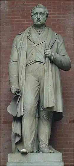 In 1862, a memorial to Stephenson by John Graham Lough was erected close to Newcastle Central Station, in his hometown of Newcastle upon Tyne. The memorial shows a bronze statue of Stephenson on a grit-stone base, with four further bronze figures (an engineer, blacksmith, miner, and plate-layer) at the four corners of the base. The statue is Grade II listed.[37][38][39]