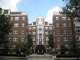 His work included a range of styles, from Tudor Revival to Gothic to Colonial Revival; and as the Art Deco style became popular, he created some memorable apartment buildings in that motif.[4] Two of the more prominent buildings that he designed are: 3901 Connecticut Avenue, NW (1927); and 2101 Connecticut Avenue, NW (1929) where he was assisted by Joseph Abel. The imposing brick structure of "2101" is now a co-op and is considered to be one of the finest apartment houses in the city.[5] Both of these are listed on the National Register of Historic Places. Santmyers created many other exceptional apartments houses, most often in the Northwest areas of Washington; and several of these have also been historically registered. For instance, Meridian Manor, built in 1926 in the Colonial Revival style, and located in the Columbia Heights neighborhood, was listed on the National Register of Historic Places in 2001.[6] A large number of his other works were standard residential structures, usually brick; many were rowhouses. Today, numerous and diverse blocks that make up the basic background landscape of the city of Washington are composed of buildings that were designed by George T. Santmyers.