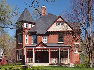 The house is two stories tall and is built in the Eastlake style. It has a distinctive silhouette, with multiple roof shapes, dormers, a square tower, and tall brick chimneys. The large front porch has wooden posts and balusters, with a pediment over the entrance. The exterior is embellished with stone window trim, transoms, scalloped wooden shingles in the gables, and belt courses. It was designed by prominent Minneapolis architect Charles S. Sedgwick.[4]