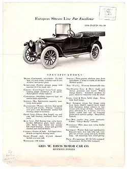 In 1908, George W. Davis announced that he would build a car, named after himself. The earliest cars were motorized buggies. By 1911, proper touring cars were made, using 4-cylinder Continental engines, with 6-cylinder Continental units added three years later.[1] A 12-cylinder engine was promised, but this never materialized. The local Richmond newspaper reported that Davis was unhappy about the weight of the 12-cylinder engine. Thus, after the fours were dropped from the lineup in 1916, all Davis cars bore a six-cylinder engine.[1] It was not until 1927 that an 8-cylinder engine arrived.