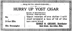 - ^ "Advertisement for Hurry Up Yost Cigars, George W. Gregory Distributor". The Inlander, Vol. 13. March 1903.