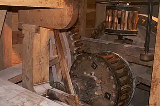 The internal millworkings and structural members installed during the 1933 reconstruction were taken from an 1818 gristmill located near Front Royal, Virginia. Some of the structural members from Front Royal mill are still in the building; however, most of the millworkings were replaced between 1997 and 2002. The interior has exposed masonry walls with heavy timber framing. The flooring throughout the building is random-width pine. A masonry fireplace is in the southwest corner of the first floor. The grinding platform is accessed from the second floor. The third level is one large room with rolling screens and other processing equipment. A staircase in the western half of the structure runs from the first floor to attic. The mill's two grinding stones are powered by a pitch-back water wheel. The mill machinery is enclosed in a hurst frame,[10] built from heavy oak and pine beams. Its frame is built directly on the mill's foundation, and is not connected to the walls. This protects the structure from the machinery's potentially damaging vibrations. The hurst frame occupies the eastern half of the first two levels.[4]