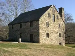 The gristmill is a Colonial Revival-style stone building that was constructed in 1933 based on archaeological and documentary evidence. Its rectangular footprint measures 37 feet (11 m) by 50 feet (15 m). Its foundation is built into a hillside, with two and one half stories above ground on the north side and three and one half stories on the south side. It is a masonry structure built with sandstone arranged in a random pattern with stone lintels and sills. The mill's roof is covered with wooden shingles. On the south side of the building is a vertical-board door on the first floor; there is an identical door on the ground floor on the north side as well. Both have stone landings. The millrace enters the mill on the north side and exits at ground level on the south side.[4]