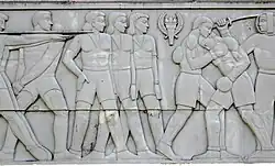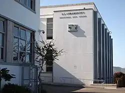 The City of San Francisco set aside $2 million in 1930 to build a high school to serve the Richmond District, its seventh public high school and most expensive school at that time. The three-story academic building was designed by Timothy L. Pflueger and inspired by Washington's home in Virginia, Mount Vernon.[4] It was planned to accommodate 3,000 students.[8] Arnautoff was assisted by George Harris and Gorden Langdon in his work on the murals,[8] and the school also has mural work by Ralph Stackpole, Robert Boardman Howard, and Lucien Labaudt,[9] and bas relief faces by Arnautoff of Washington, Thomas Edison, and William Shakespeare above the main doors.[6][10] A bas relief frieze on the wall of the football stadium, Athletics, is by Beniamino Bufano and Sargent Johnson.[8]