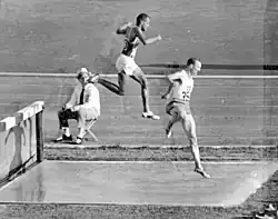 ![]() Young right behind Gunnar Tjörnebo over the last hurdle in the 1960 Summer Olympics | |||||||||||||||