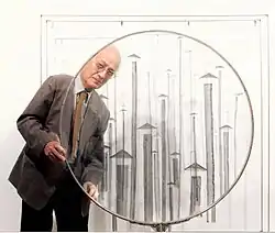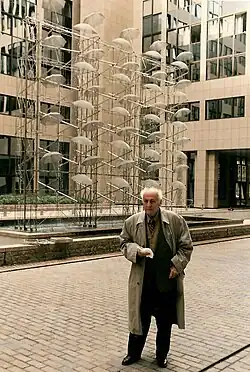 In 1997 Zongolopoulos created Tel - Néant, an artwork made by stainless steel and plexiglas[21] presented in that year's Venice Biennale and in 1999 exhibitions held in Berlin (Wittenbergplatz) and Weimar.[3] Nowadays the sculpture is placed at OTE headquarters in Athens.[22] In 1998, Zongolopoulos created another sculpture from stainless steel under the name Composition of Circles[23] or Olympic Circles[5] as a reference to the Olympic rings while the following year he created Column, a 21 m. high artwork presented at 1999 Venice Biennale and placed later near Evangelismos metro station, Athens.[5] In 2001 Zongolopoulos made his last artwork, a stainless steel sculpture known as Irana[5] (a name taken by its creator from the Dorian Greek form of the name Irene).