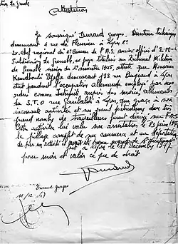 After the war, Georges Durand became a judge at the military tribunal in Grenoble during the period of the Epuration.[5] He later settled in Lyon, on Rue de Fleurieu in the 2nd arrondissement.[5] He was awarded the rank of Officer of the Legion of Honour, and also received the Croix de Guerre with a palm and became Officer of the Order of Merit of the Republic of Poland.[7]