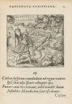 Montenay's work was thought to have first appeared in 1571, but a copy in the Royal Library in Copenhagen shows that it first appeared in 1567 and had been languishing in the hands of her publishers, Jean Marcorelle and Philippe de Castellas, since 1561. The delay may be explained by the religious turmoil of the time making early publication unwise. The Peace of Saint-Germain in 1570 raised hopes which were soon dashed by the 1572 St. Bartholomew's Day Massacre. In 1584 a Latin version was published, followed in 1619 by the Frankfurt-am-Main polyglot edition in Spanish, Italian, German, English and Dutch. The same illustrations are used in all three editions, so that the plates needed moving between Lyons, Zurich and Frankfurt. The motto or title included in each engraving is in Latin, and is invariably a quotation from the Vulgate version of the Bible, a book with which the common people shared an easy familiarity. The reader was expected to be able to place the quotations in context.[3]