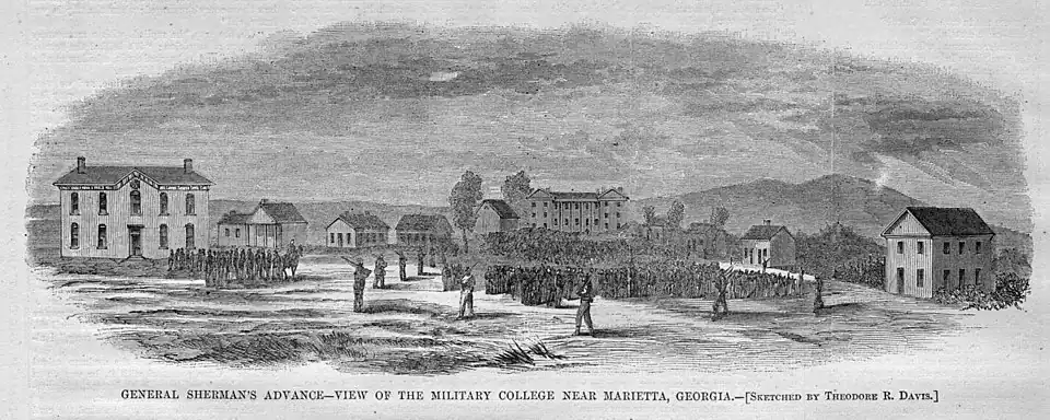 During the Civil War, superintendent Francis W. Capers sent cadets to use as drill instructors for CSA, and other cadets volunteered or were drafted.[2] On May 14, 1864, GMI cadets fought in the Battle of Resaca and made contact with the 9th Illinois Mounted Infantry regiment.[3] After this single engagement, the cadets were pulled off the front line.[4]