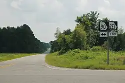 The 1944 GDOT map showed that SR 233 was established in 1944 along the same alignment as it runs today, with the portion concurrent with SR 112 being paved.[2][3] However, the 1946 GDOT map showed that the paved section was only the section from an undetermined point in Rochelle to the northern intersection with SR 112.[5][6] By 1952, a short section just south of Rochelle was paved.[7][8] By 1961, the road was paved from its southern terminus to its northern intersection with SR 112.[9][10] By 1964, the road was paved the rest of its length.[11][12]
