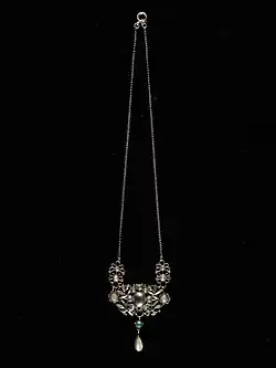 The Gaskins were leading jewellers of the Arts and Crafts movement,[4] mostly in the Birmingham area. In 1899 the Gaskins started producing jewellery together, under the name of Mr and Mrs Arthur Gaskin. Despite having no technical expertise initially, they learnt many skills and employed others where necessary.[1] Georgie designed all of the jewellery that they made together,[1] though both were involved in making it.[2] They produced silver and enamel work, book illustrations and jewellery both independently and in partnership. Georgie's jewellery was initially quite simple, consisting of silver wirework set with coloured stones and enamel, as time went on it became more ornate, often being set with gems by the time of the First World War. She continued to design jewellery until shortly before her death.[1]