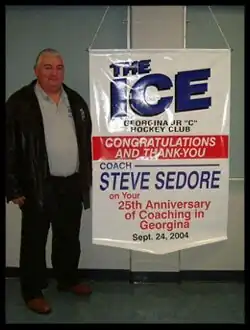 Also in 2004 the Georgina Ice honored longtime head coach Steve Sedore for his 25 years of coaching. He has been a constant fixture with the Ice over their 13 years. He was the head coach in the first season and has held various positions since. Steve is the longest serving and winningest coach in Ice History and has held coaching positions with the Stouffville Spirit, Couchiching Terriers and the Newmarket Hurricanes. He has also been involved in minor hockey with Georgina and York Simcoe.