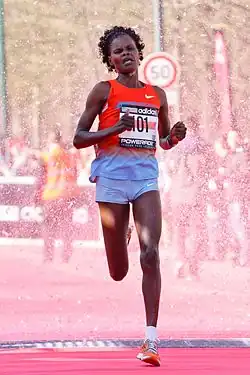 She was a distant second to Mary Keitany at the RAK Half Marathon at the start of 2012, but was five seconds off a personal best.[12] In her first World Major Marathon appearance, she reached the podium at the 2012 Boston Marathon. Warm temperatures disrupted the event, but she managed to make it a Kenyan sweep in the women's race with her third-place finish.[13] She improved her personal best to 67:58 minutes to win the Udine Half Marathon and took three minutes off her best at the Frankfurt Marathon, where she was second in a time of 2:21:39 hours.[14]