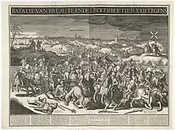 ![]() Battle of Lekkerbeetje (5 February 1600), engraved by Joannes Doetecum II after Sebastian Vrancx, published by Claes Jansz. Visscher II (1631). Gerard Abrahams ("Lieutenant Lekkerbeetje") lying dead at bottom left. | |