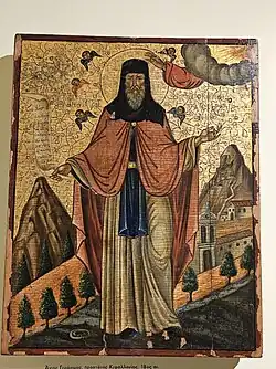 Gerasimos (1506-1579) came from the aristocratic and wealthy Notaras family.[3] He was ordained a monk at Mount Athos, went to Jerusalem for 12 years,[4] spent some time in Crete and Zakynthos and in 1555 arrived on Kefalonia. He spent his first 5 years in a cave in the area known as Lassi. He subsequently cultivated the area where the monastery of Saint Gerasimos now exists near Valsamata. The monastery which he established cared for the poor and became a center for charity.