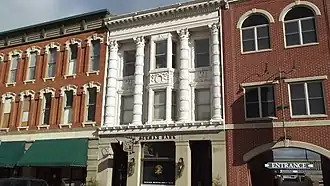 German Bank is a historic building located in the Lower Main Street district of Dubuque, Iowa, United States. The city's German community was its most prominent ethnic group in the mid to late 19th century.[2] Like many other Iowa cities of that era, Dubuque had banks that were owned by, and catered to, members of their particular immigrant communities. T.H. Thedinga, the city's first German-born mayor, started this bank in 1864 to serve immigrant Germans. In 1868 it moved from its original location on Main Street and into the former Dubuque Miners' Bank building. That building was torn down in 1901 in order to construct this one. It was designed by Dubuque architect John Spencer in partnership with Chicago architect W.G. Williamson. The three-story brick building has a highly decorative main facade composed of polished pink granite on the main floor and terra cotta on the upper two floors. Decorative elements include egg-and-dart, Greek fret, a row of small lions' heads, bay windows, scroll pediments, imperial German eagles, and a bracketed cornice with dentils. The second and third floors are dominated by four fluted, banded columns with Corinthian capitals.