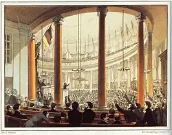 Of course, the German states and the Federal Convention made those decisions under pressure of the revolution. They wanted to avoid a breakup with the Frankfurt Parliament. (Already in August this pressure faltered, and the larger states started to regain power.) According to historian Ernst Rudolf Huber, it was possible to determine a continuity or even legal identity of Confederation and the new Federal State. The old institution was enhanced with a (provisional) constitutional order and the name German Confederation was changed to German Empire.[7] Ulrich Huber notes that none of the German states declared the Imperial Regent John and his government to be usurpatory or illegal.[8]