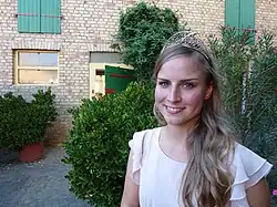 The German Wine Queen (German: Deutsche Weinkönigin) is the representative of the German wine industry. The Wine Queen is supported by two princesses, forming together the German Wine Ambassadors. She is elected, usually in the Palatine town of Neustadt an der Weinstraße, for a period of one year.[1][2] The title is competed for by the regional wine queens of the thirteen German wine regions producing "quality" wine.