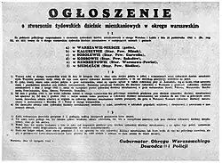 On October 28, 1942, the Supreme Commander of SS and the Police in the General Government SS-Obergruppenführer Friedrich Wilhelm Krüger (HSSPF "Ost") issued a regulation on the creation of so-called remnant ghettos in selected cities of Lublin and Warsaw districts.[16] On November 10, 1942, a similar decree was issued for the districts of Kraków, Radom and Galicia.[19] In § 3 of these regulations, the threat of the death penalty is repeated for people providing shelter or food to Jews who hide outside the designated housing districts. At the same time, unspecified police sanctions (sicherheitspolizeiliche Maßnahmen) were announced against people who do not inform the occupation authorities about the known fact of Jewish presence outside the ghetto (in practice, this meant deportation to a concentration camp). At the end of 1942, a similar decree for the Białystok district was announced by gauleiter of East Prussia Erich Koch. Strict penalties for helping Jews were also imposed in the Warta Country.