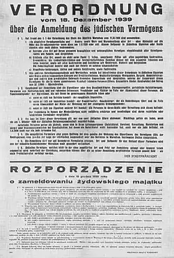 Germans also took actions aimed at the pauperization of Jews and their exclusion from the economic life of the occupied country.[3] Industrial, trade and service enterprises owned by Jews were confiscated in large numbers. Extensive restrictions have also been introduced in the areas of handicraft production, small-scale trade, property management and money transfer.[3][1] The legally sanctioned "aryanization" of Jewish property was accompanied by individual ("wild") looting.[3] Contributions and special taxes were also imposed on Jews.[3] Representatives of the Jewish intelligentsia were deprived of the right to pursue liberal professions and were dismissed from work in public institutions.[6][3] The decree issued by Hans Frank on October 26, 1939, included forced labor for the Jewish population in the General Government.[3] Two years later, forced labor for Jews was introduced in the territories incorporated into the Reich, however, only by sanctioning the state of matters that had existed there since the first months of the occupation.[3]
