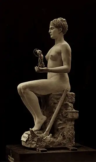 Also in 1890, responding to widespread fascination with the ancient Tanagra figurines recently excavated in Greece, Gérôme sculpted the 5-foot-high, tinted-marble Tanagra, a female nude personifying the Tyche, or presiding spirit, of the ancient city. She holds on her upraised palm a figurine of a female Hoop Dancer (Gérôme's own invention, inspired by, but not a copy of, an actual Tanagra figurine). "Inspired by his characteristic desire for both archaeological accuracy and realism, Gérôme delicately tinted the skin, hair, lips, and nipples of his Tanagra, causing a sensation at the Salon of 1890."[26]