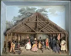 Schouten was born in Paramaribo, the capital of Surinam, then a Dutch colony. The son of Hendrik Schouten, a Dutch government clerk, and Suzanna Hanssen, a free black woman, he was an autodidact and taught himself how to paint.[1] Schouten was the first Creole working as a professional artist.[3] Many of his dioramas depict dus, dance parties practiced by the black enslaved populations in Suriname. These performances, conducted in the Surinamese creole language Sranan Tongo enabled the groups to exchange information and criticize the colonial regime that enslaved them.