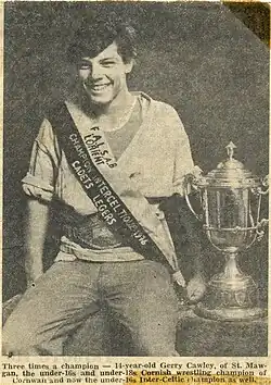 Gerry Cawley originally from St Mawgan in Cornwall is well known for being a Cornish Wrestling Champion. Gerry Cawley retired from competitive wrestling although can still be found acting as a stickler (referee) in the Cornish Wrestling ring.