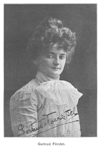 Gertrude Förstel (21 December 1880 – 7 June 1950) was a German operatic dramatic soprano and an academic voice teacher. She performed the soprano solo in Mahler's Fourth Symphony internationally, and participated in the premieres of Eugen d'Albert's Tiefland and Mahler's Eighth Symphony.