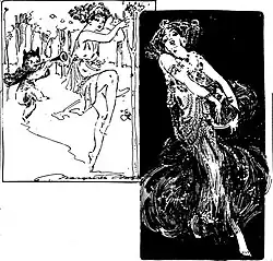 Her choreography and special dance effects brought her high praise and rebuke. Her interpretive Salome dance, which she first performed in 1908, brought her fame while causing scandal at many theater houses nationwide. On several occasions, her suggestive Salome dance in scant costumes led to her arrest by local police.[10] Following Hoffman's success, dancers as diverse as Eva Tanguay, Vera Olcott, Lotta Faust, Ruth St. Denis, La Sylphe, and Ada Overton Walker offered a burlesque Salome dance as part of the popular craze known as "Salomania."[11]