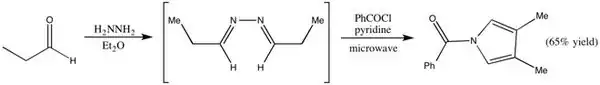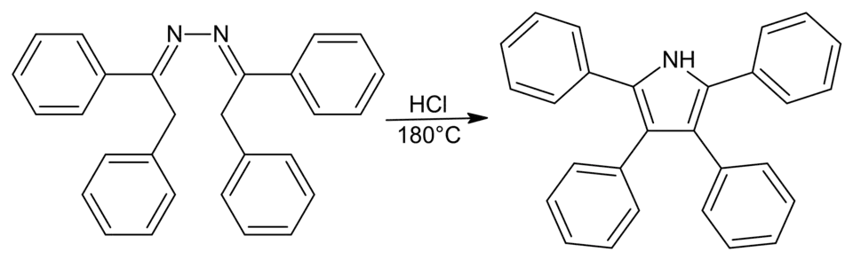 There are, however, a few problems with some syntheses. The Piloty-Robinson reaction competes with the formation of pyrazoline when the reactant is an aliphatic azine derived from a ketone. Also, under high temperatures and highly acidic solutions, azines derived from aldehydes are not stable. This prevents the formation of 2,5-disubstituted pyrroles (where R=H) using this method.[12]