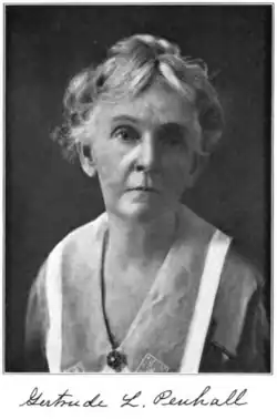 Gertrude Penhall (also known as Gertrude Leah Barker-Penhall; 1846 – December 10, 1929), a California pioneer and early settler, was also an American civic leader and clubwoman.[1] She was one of the oldest residents of Nevada County, California where she spent practically all of her life. Penhall took an active part in civic and social affairs, as well as movements that had for their aim the improvement of the county and that tended to enhance the comfort and happiness of its people.[2]