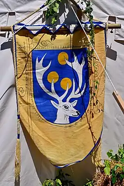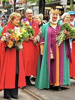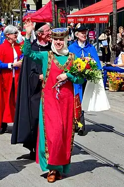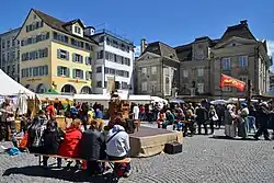 In medieval times, in Zürich all female and male Bürger were members of the guilds, but beginning in the 19th century women were no more tolerated within the guilds then more as decoration of their men being still members of the guilds of Zürich. The history of the Gesellschaft zu Fraumünsters dates back to the late 9th century when the abbess of the Fraumünster Abbey (853 A.D.) in fact reigned the city of Zürich as Fürstäbtissin (imperial abbess) nominated by the king of the Holy Roman Empire, among them Katharina von Zimmern.[2] Gesellschaft zu Fraumünster, being the society of the former noble women of the Fraumünster Abbey, was established in 1989. Now, the honorable women of the society cultivate the virtuous habits of the former abbey by p.e. honoring the work of engaged women in the modern society. Beginning fifteen years ago, the society started to organize every three years the so-called Mittelalter Spectaculum, a medieval funfair, at the Münsterhof square.