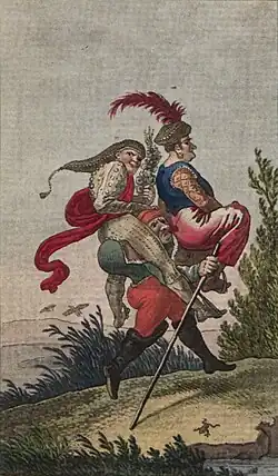 Apel and Laun included stories both with and without ghosts, but also those where the question is left open – an innovation that was later expanded on by other authors.[3] They tried to add variety to the first volume by adding two comic fairy tales: "König Pfau" (Apel's retelling of Madame d'Aulnoy's "La Princesse Rosette"[4]) and "Das Ideal" (an original tale by Laun), but the response to these stories was negative, and they did not include fairy tales in later volumes.[2] The first volume also included "Der Freischütz", a story written by Apel about a hunter making a pact with the devil. Johann Georg Theodor Grässe traced the origin of this story to a 1730 book called Monatliche Unterredungen aus dem Reich der Geister ('Monthly Conversations from the Spirit-World') which contained a similar story taken from a 1710 court session in Bohemia. Laun owned a copy of this book, and Grässe theorised that he brought the story to the attention of Apel.[5][6] Some characters in the stories may have been based on personal acquaintances, such Carl Friedrich Wilhelm Wagner (1770–1813), a police actuary, who may have inspired "Aktuarius Wermuth" in "Die schwarze Kammer".[7]