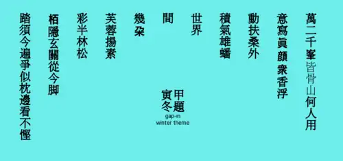 The upper right corner contains a set of 60 characters. The four central ones, 甲寅冬題, are making like an island and say "Gapin(1734) winter theme".