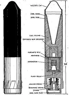 The Gewehr-Panzergranate was an anti-armor weapon which upon hitting the target ignited the PETN base fuze which in turn ignited the TNT filling which collapsed the internal steel cone to create a superplastic high-velocity jet to punch through enemy armor.[1] Since shaped charge weapons rely on chemical energy to penetrate enemy armor the low velocity of the grenade did not adversely affect penetration. A downside of the Gewehr-Panzergranate was its short range 46–114 m (50–125 yd).[2]