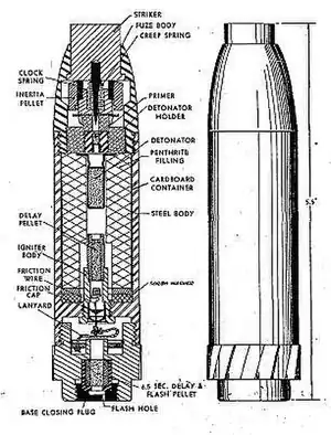 Detonation mechanism | Impact Fuze 4.5 second friction igniter 6.5 second time fuze 11 seconds total[1] |