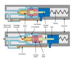 In June 1943 the Mauser Werke's Weapons Research Institute and Weapons Development Group decided to adopt the Gewehr 43 design to use a relatively cheap to produce roller locked action. The production pattern Gewehr 43 used a more expensive to produce and less sturdy Kjellman-style flapper locking system. These locking methods are similar in concept. By December 1943 Mauser Werke's Weapons Research Institute and Weapons Development Group had completed a roller-locked prototype rifle designated as the Gerät 03. Aside from the differing action, the Gerät 03 prototype resembled the Gewehr 43. Although the prototype rifle was machined it was designed with pressing and stamping steel components production methods in mind to simplify mass production and keep production costs low. Only a few prototypes were built and the Gerät 03 never went into production, but the Gerät 03 was put through a 5,000-round endurance trial. The Gerät 03 semi-automatic rifle used a fully locked action design with a gas system, using a gas piston to unlock. During test firing, the development group noticed an undesirable tendency in the Gerät 03 action to exhibit bolt-bounce. It was possible to unintentionally fire the Gerät 03 during the bounce phase, at which the action was not fully locked. This opened the Gerät 03 action much faster and under much higher pressure than the gas system was supposed to allow. This observation of a harmonics problem in the roller/wedge system led to the idea and development of the intentionally never fully locked roller-delayed blowback action design, which does not require a gas system.[6]