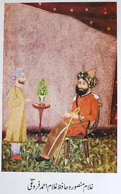 Ghulam Mansoor was a scholar of repute in both Arabic and Persian. He was a member of the Maratha army during rule of Maharaja Senasaheb Subha Chhatrapati Raghuji Bapusaheb Bhonsle III of princely state of Nagpur (1818–1853). In 1252 AH / 1836 AD, he visited Tijara, built wells and replanted many trees inside the Big Bagh. In 1263 AH / 1845 AD, he left the services from Nagpur and shifted to Tijara. In Nagpur, his relative had a Risala (mounted troop) of 100 horse riders with Naqqara and Nishān (insignia). Later on after some months, he with some other relatives, joined 15th Battalion of Punjab Regiment. Roughly 10 years until 1271 AH / 1855 AD, he remained posted at Lahore, Peshawar, and other cities of Panjab. In 1856, when Britisher captured Awadh, he also remained at Cantonment of Sultanpur. After retirement from army, he finally settled at Tijara.[1]