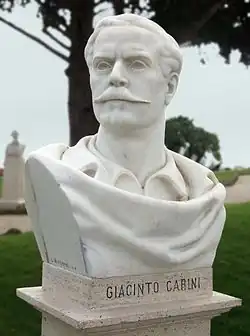 The wound caused by a bullet in 1860 could no longer heal, bringing torments and pains.[1] He died in Rome on January 16, 1880 : in 1912 the body was moved to his hometown, in the church of San Domenico [1] ; a marble bust was dedicated to him inside the Falcone-Morvillo villa, in viale della Libertà in Palermo,[1] and at the base of this sculpture there is an epigraph that reads these words: "To general Giacinto Carini, who magnanimous in exile, in the brave fight among the thousand, the mind the arm the heart, sacred to Italy[6] Also in Rome on the Janiculumthere is a Bust of Giacinto Carini. Rome and Padua have dedicated a street to him.