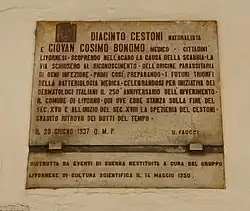 Plaque dedicated to Diacinto Cestoni and Giovan Cosimo Bonomo for their scientific contributions.
